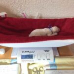 Um 22:10 kam unser Golden-Boy zu uns. Er wog 388 g und war gleich ein Sonnenschein. Seine Plazenta habe ich retten können, also habe ich sie, während Lizzy mit der Versorgung ihres Jungen beschäftigt war, abgeklemmt und versteckt, damit Lizzy sie nicht frisst. Sie hatte ja schon 6 Plazentas intus und ich wusste nicht, ob ich noch welche retten werden kann, denn Lizzy war meistens schneller als ich.