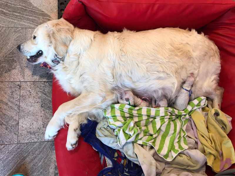 Unsere liebe Lizzy hat am 27.06.2020 auf 28.06.2020 ihre Babies und unsere Goldschätze geworfen. In der Trächtigkeit schätzte ich zuerst, dass sie möglicherweise 8 Babies bekommen wird und als Lizzys Bauchi größer und größer wurde war ich mir ziemlich sicher, dass sie uns 10 kleine Engel schenken wird. Nun hat Lizzy von Samstag auf Sonntag 11 wunderhübschen und süßen Babies das Leben geschenkt. Diese Geburt war Lizzys erste schmerzliche, aber auch sehr erfüllende Erfahrung. Während der Eröffnungs- und Austreibungsphase war unser Mädchen überhaupt nicht gestresst. Sie hatte keine Angst vor den Schmerzen, hat überhaupt nicht über die Schulter zu ihrem Bauch geschaut, hat nicht gewimmert und war auch nicht hektisch. Ihre Mutter dagegen hat mich, bei ihrer ersten Geburt, richtig ins Schwitzen gebracht. Ufff! 😅