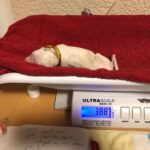 Um 19:05 Uhr nach ein paar starke Wehen, hat Lizzy Mr. Green auf die Welt gebracht. Seinen Bruder habe ich in den Wäschekorb verfrachtet, weil sie wieder in ihrer „Kack-Position“ gepresst hat. Nun hat sie unser 2. Baby aus seiner Blase befreit, hat ihn abgenabelt – nicht so millimetergenau wie Coco oder Gipsy, aber immerhin gut abgenabelt – und das Baby mit ihrer rauen Zunge massiert und sauber gemacht. Mr. Green wog 452 g bei der Geburt.